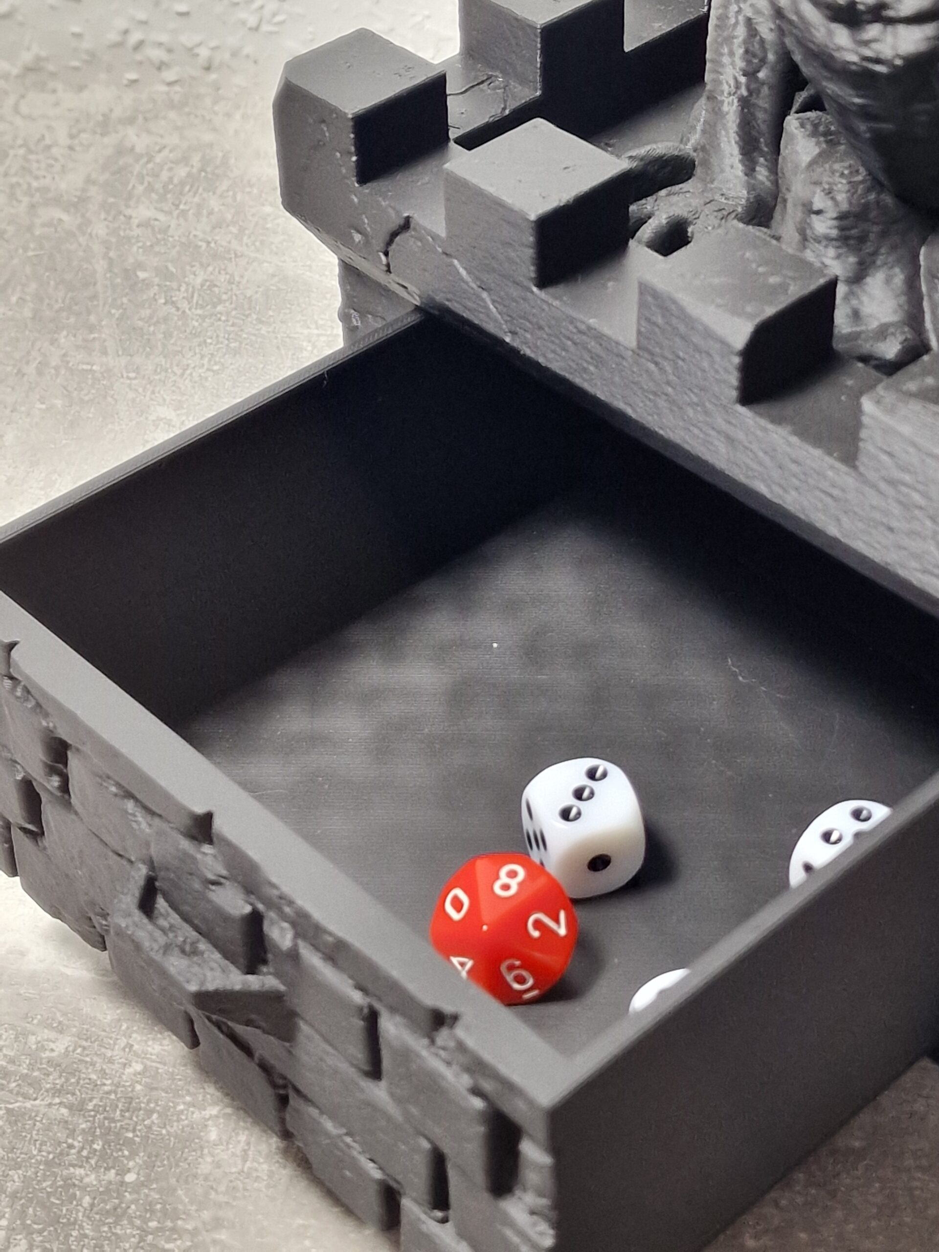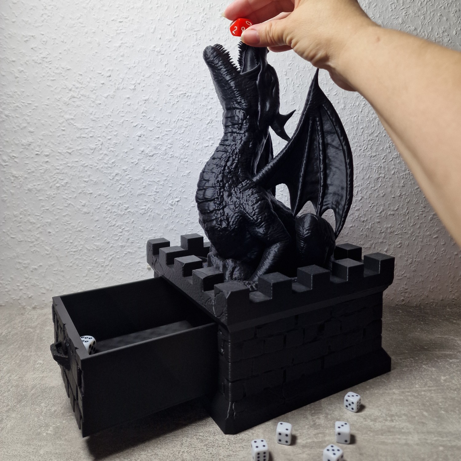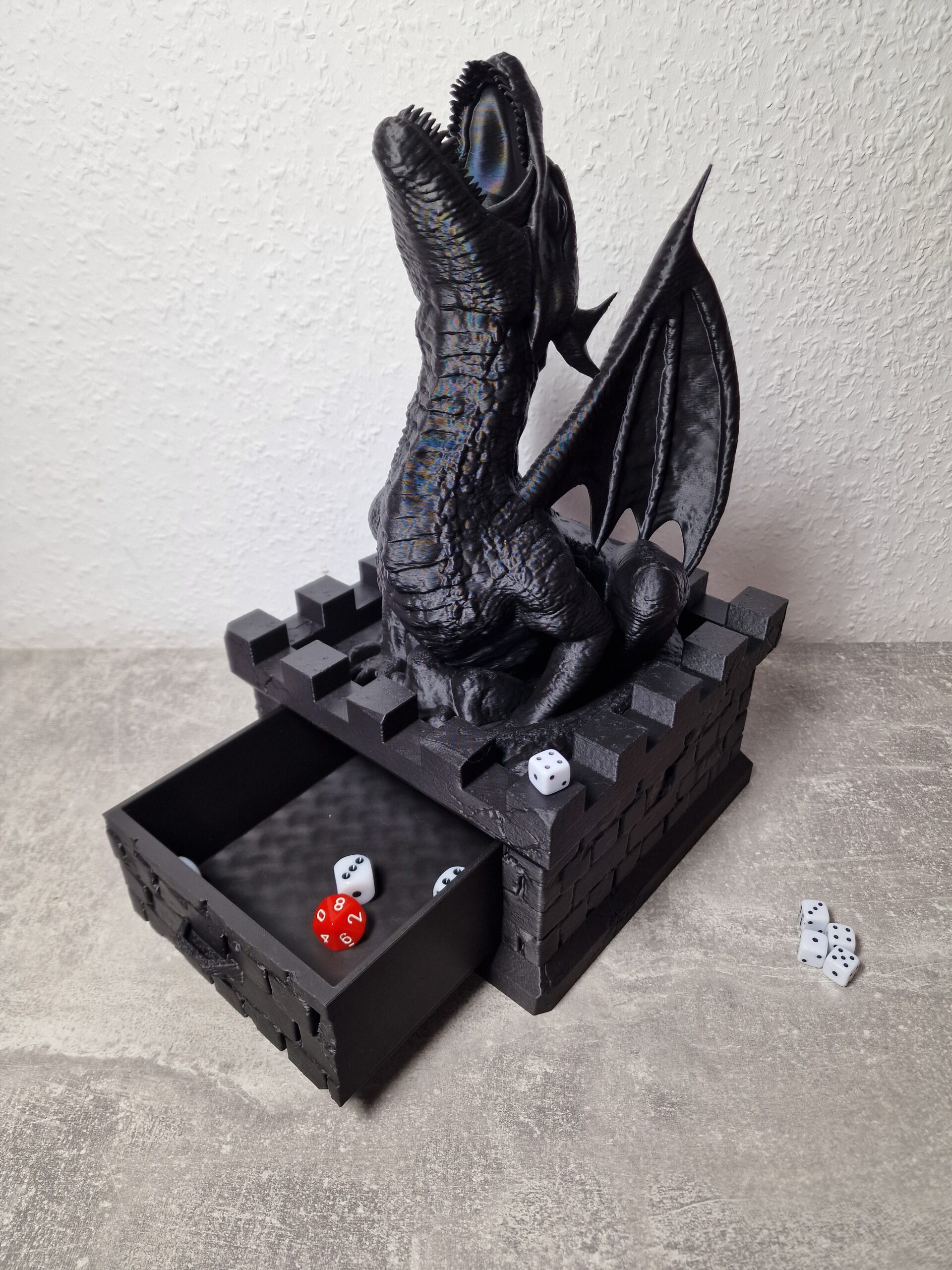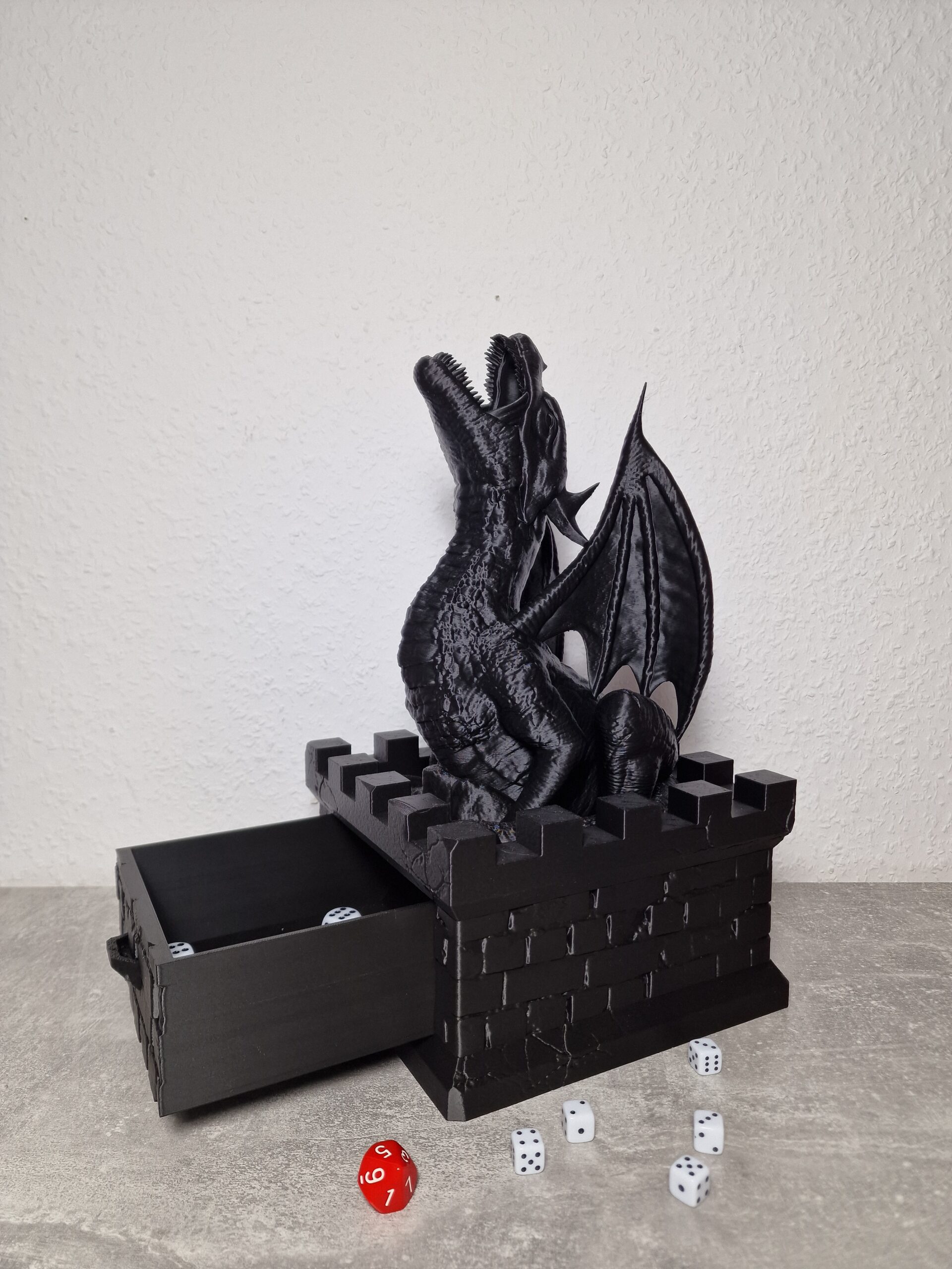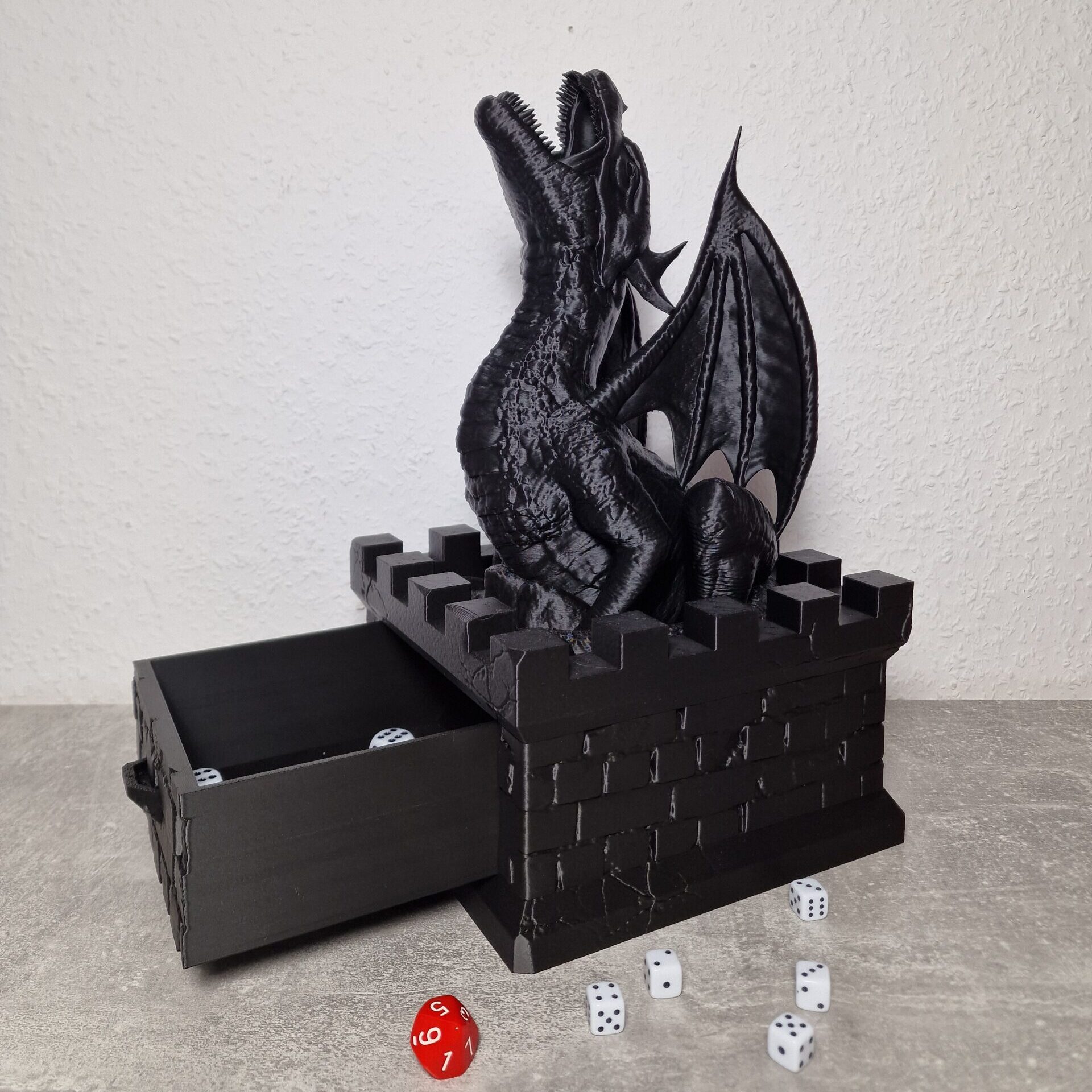 Der Drachengewölbe-Würfelturm vereint episches Fantasy-Design mit durchdachter Funktionalität. Ein imposanter Drache bewacht deine Spielschätze, während deine Würfel spektakulär durch das Gewölbe rollen und sicher in der Schublade landen – stilvoll, praktisch und ein echter Blickfang am Spieltisch.
