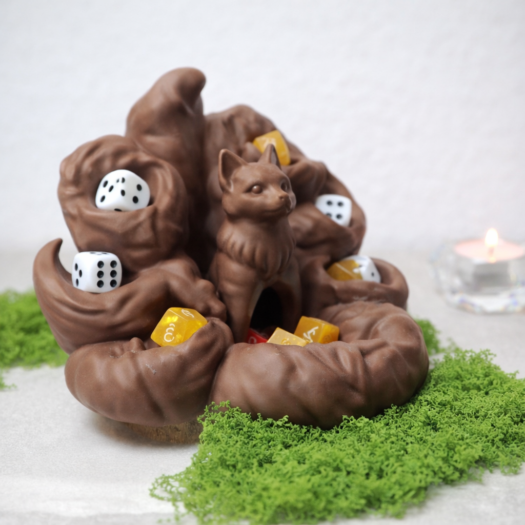 Der Kitsune-Würfelturm ist mehr als nur ein Würfelturm: Er vereint Funktionalität mit mystischem Design. Als Würfelmaschine sorgt er für spannende Würfelwürfe, während er gleichzeitig als Würfelwächter dient – in seinen vielen Enden lassen sich zusätzliche Würfel stilvoll aufbewahren. Ein echtes Highlight für jeden Spieltisch!