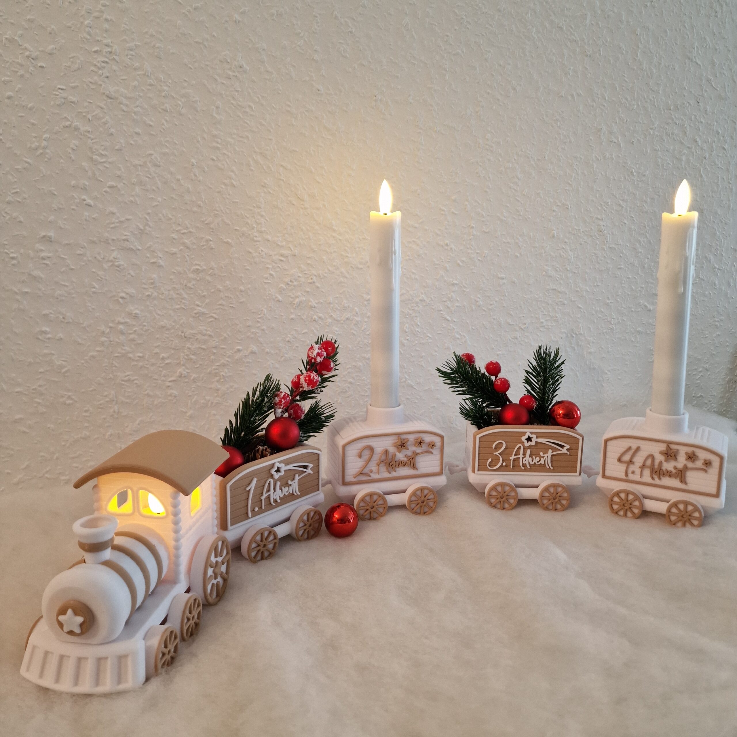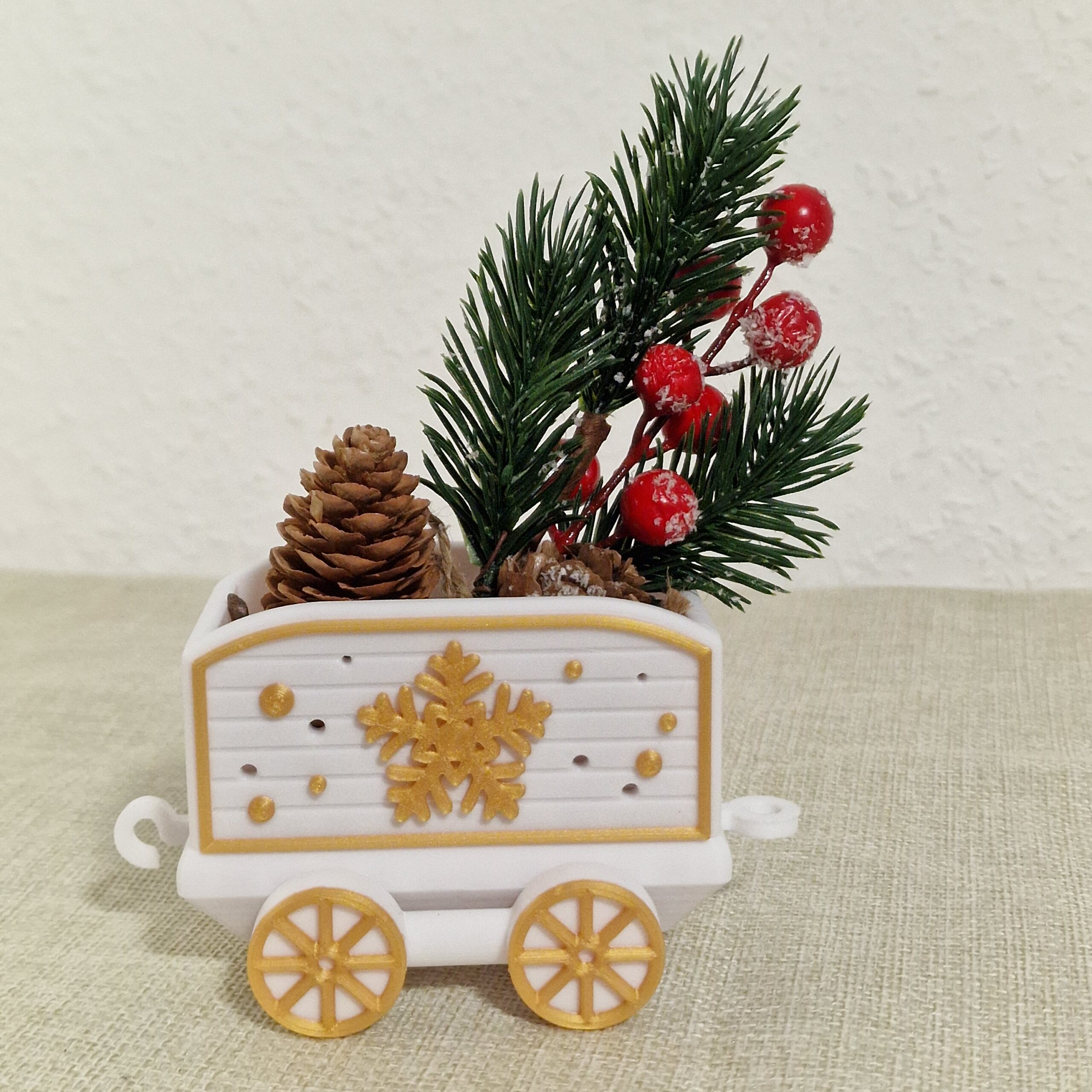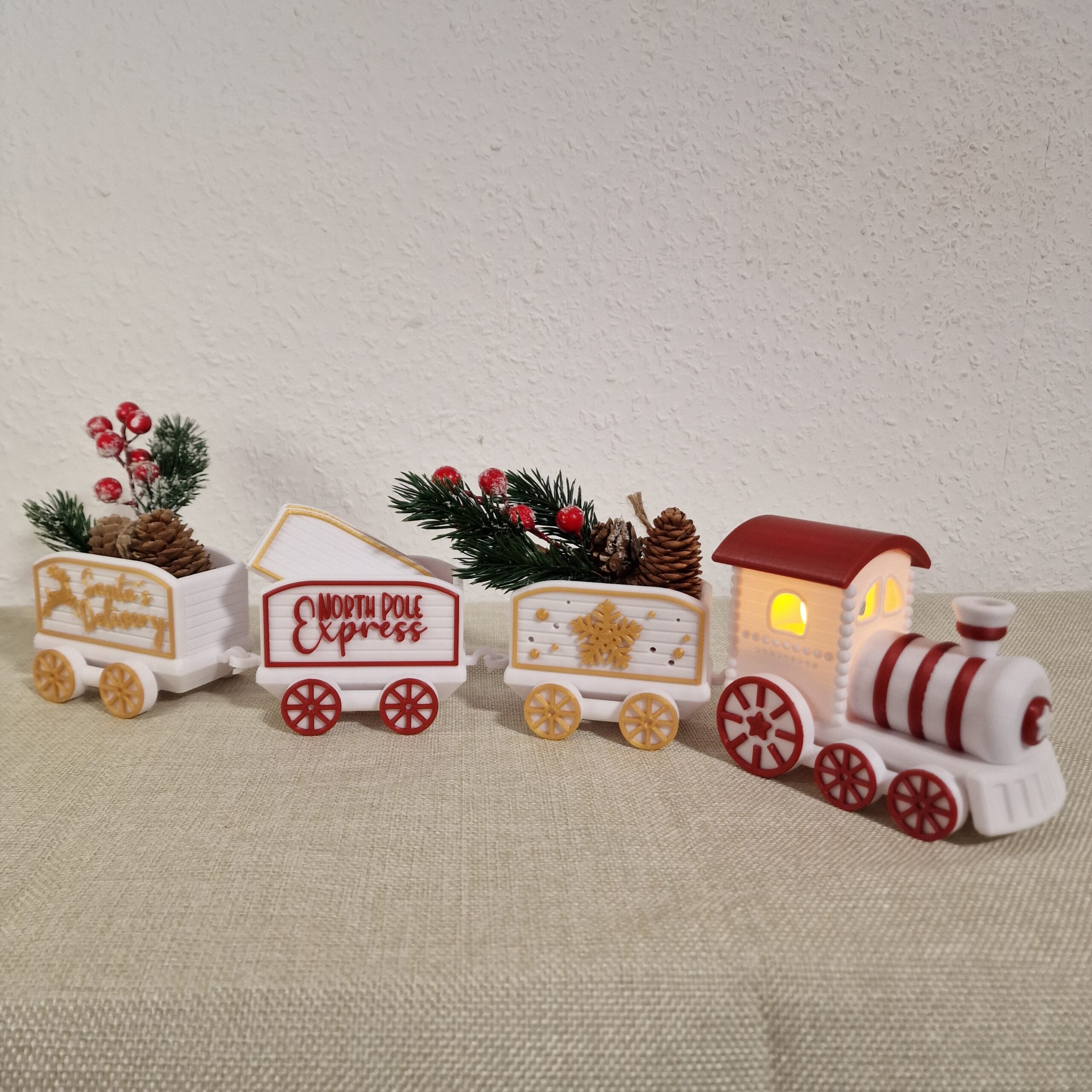 Ein festlicher Hingucker für die Advents- und Weihnachtszeit: Der detailverliebte Weihnachtszug bringt nostalgischen Charme und moderne 3D-Druckkunst in dein Zuhause. Ob auf dem Sideboard, der Fensterbank oder als Teil deiner festlichen Tischdeko – dieser Zug sorgt garantiert für staunende Blicke. Der Weihnachtszug kommt mit jeweils 4 Wagons, die man einfach hinzu oder abnehmen kann.