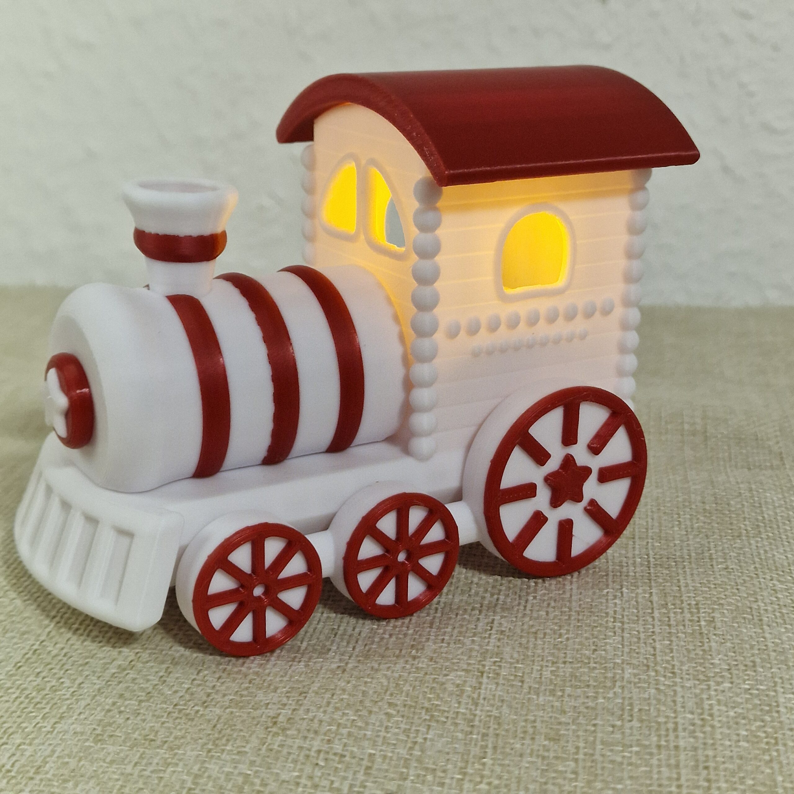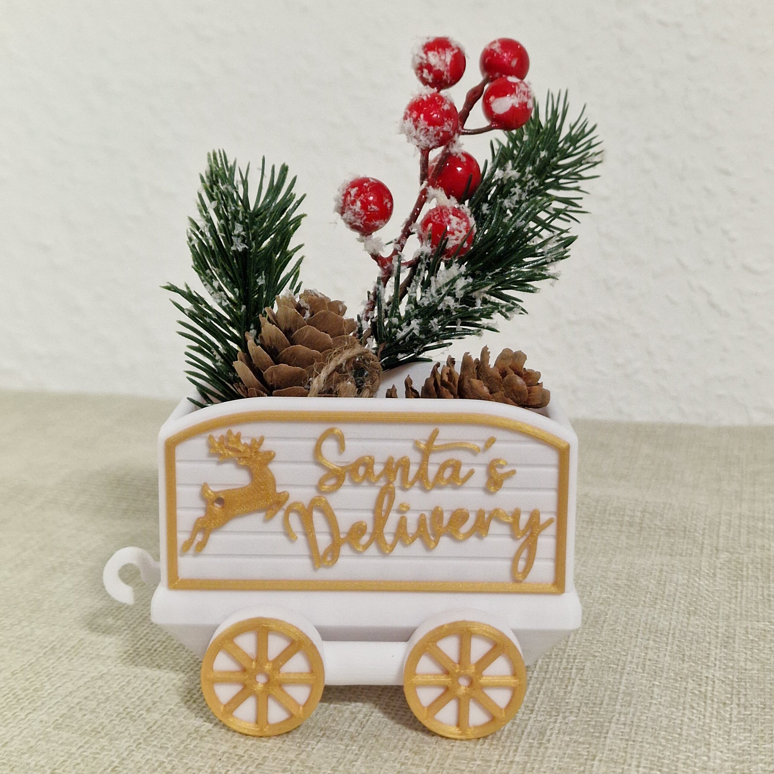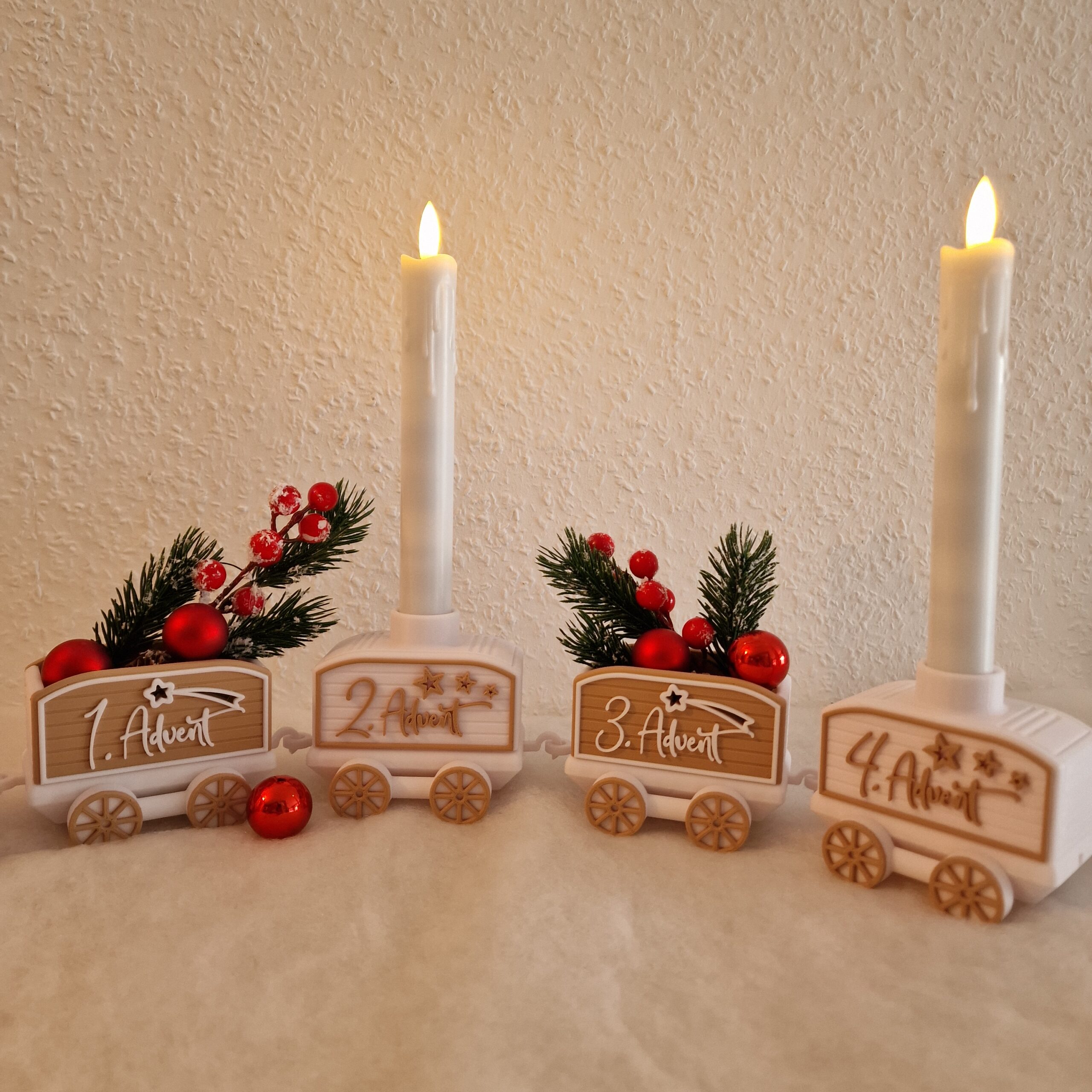 Ein festlicher Hingucker für die Advents- und Weihnachtszeit: Der detailverliebte Weihnachtszug bringt nostalgischen Charme und moderne 3D-Druckkunst in dein Zuhause. Ob auf dem Sideboard, der Fensterbank oder als Teil deiner festlichen Tischdeko – dieser Zug sorgt garantiert für staunende Blicke. Der Weihnachtszug kommt mit jeweils 4 Wagons, die man einfach hinzu oder abnehmen kann.