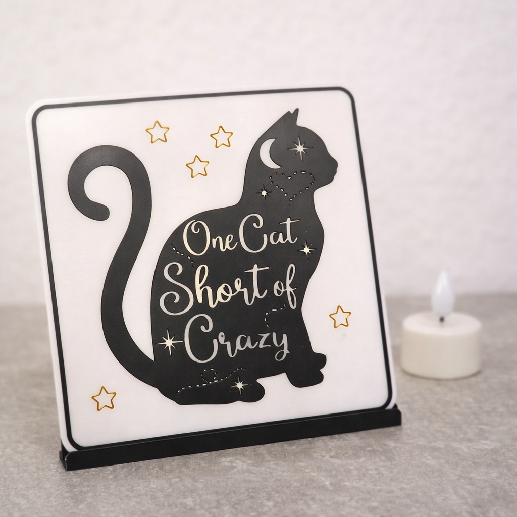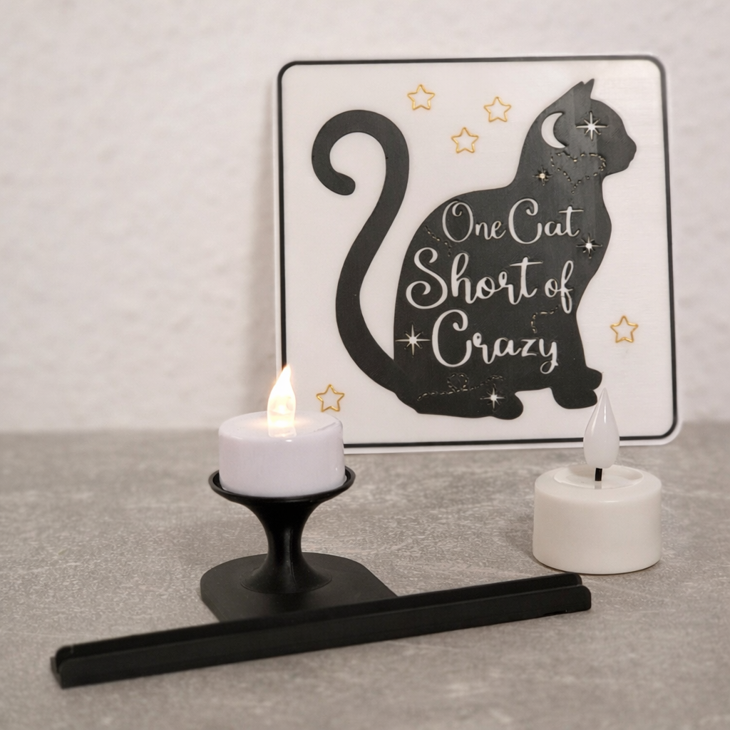 Diese humorvolle Statement-Kachel „One Cat Short of Crazy“ ist genau das Richtige für alle Katzenliebhaber mit einem Augenzwinkern. Das transluzente Design sorgt – mit einem LED-Teelicht hinterleuchtet – für eine besonders stimmungsvolle Wirkung und macht das Motiv zu einem echten Highlight.